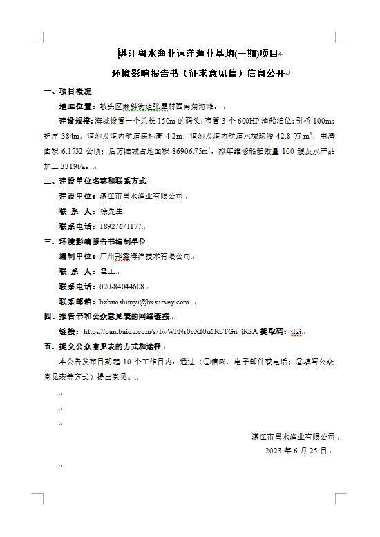 湛江粤水渔业远洋渔业基地(一期)项目 环境影响报告书(征求意见稿)信息公开